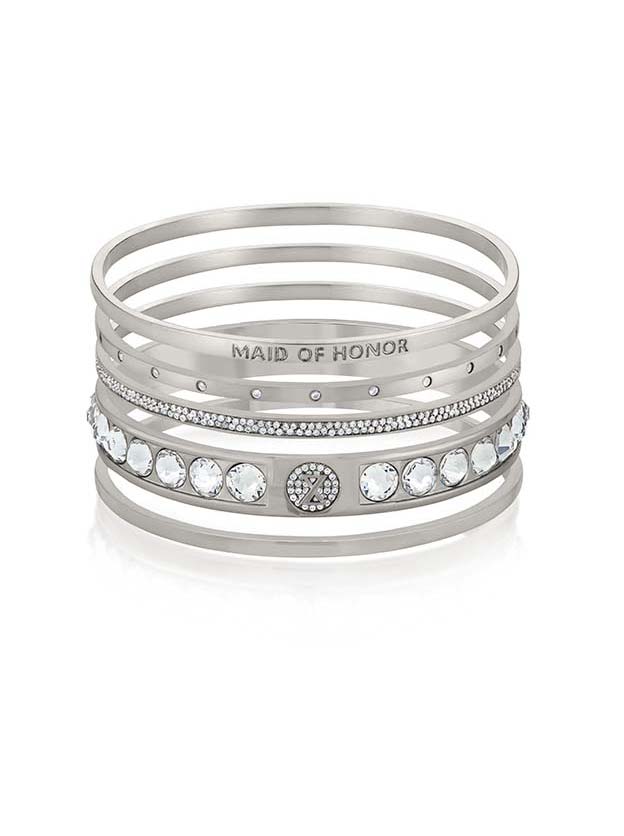 This beautiful maid of honor bracelet set is a gift that she will cherish for years to come. Featuring five bangles in alternating widths that sparkle with pavé cubic zirconia, these beauties makes a gorgeous maid of honor jewelry gift that's sure to be a hit.